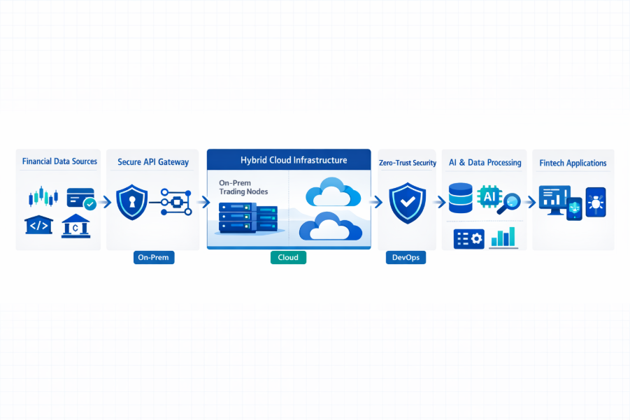 Figure: Modern hybrid cloud infrastructure workflow for fintech platforms, showing secure API ingestion, hybrid cloud deployment, zero-trust security, infrastructure automation, and AI-driven financial applications.